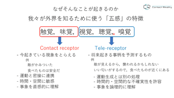 人が持つ「五感」とは、触覚や味覚、視覚、聴覚、嗅覚。この5つは実際に物に触れることで得られるコンタクトレセプターである「触覚と味覚」と、遠隔で情報を得るテレレセプターである「視覚と聴覚、嗅覚」に分けることができる。触覚と味覚は今起きている現象を捉えるもの、視覚や聴覚、嗅覚は将来起きる事柄を予測するもの。触覚を通じて病気を診断する触診は、論理的に判断するということより、事象を直感的に理解して納得することに向いている感覚を利用している。