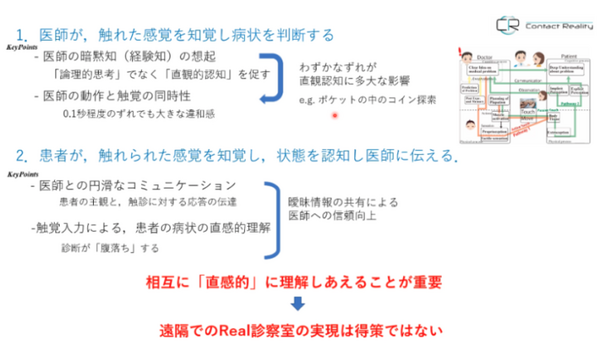 患者が触診を受けた場合も同様。触られたときにその感覚を知覚し、その状態を医師に伝えることで、患者自身も病状の直感的な理解ができる。このように触診ではその行為を通じて医師と患者が直感的に理解し合えることが重要。このため遠隔での触診をする際には、正しく触った感覚を送ることが重要なのではなく、直感的に理解し合えるようなシステムを構築することが大事になる。