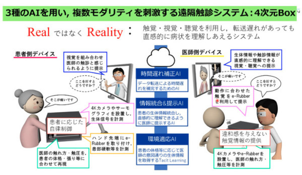 そこで、現在進めている遠隔触診システムでは「時間遅れ補正AI」、「情報統合&提示AI」、「環境適応AI」を用いて、「リアル」ではなく「リアリティー」を重視したシステムを構築している。リアルな情報を送り合うのではなく、そこにあたかも医師がいて、患者を本当に触っているかのように感じる、患者は本当に触られているように感じ、直観的に判断するのに十分な情報を送り合えることが重要。