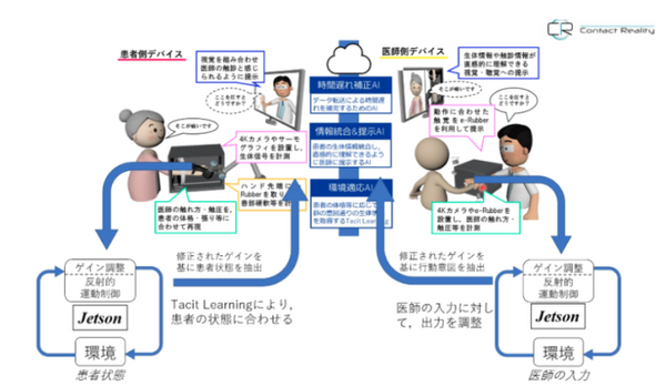 そこで使われているのは、生物規範型のエッジAIである「Tacit learning」。これは環境との相互作用により、反射ループのゲインを調整することで、環境に適応する学習アルゴリズムのこと。触診におけるTacit learningについては、 NVIDIA Jetson を用いて演算処理を行い、数値化し、リアリティ-の再現を試みている。