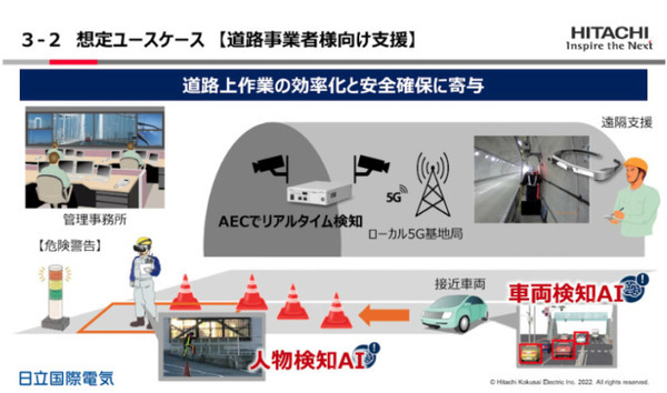 AECを活用したAI画像ソリューションでは標準搭載されている人物検知AIをはじめ、さまざまな物体を検知できる。このため道路事業や鉄道事業、製造業への活用が想定されている。道路事業では総務省の「令和3年度 課題解決型ローカル5G 等の実現に向けた開発実証」で実施される案件として、トンネル内の作業効率化と安全確保を実現する実証実験が行われている。人物検知と車両検知のAIを活用し、予期せぬ人物の飛び出しや車両の接近を即時に検知して警告することで、整備事業の安心、安全を保っている。