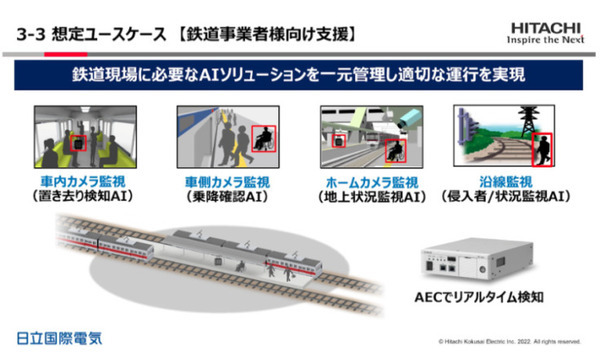 鉄道事業では車内カメラや車側カメラの実施が進み、車側カメラでは従来は目視での判断だったものにAIによる乗降確認を加えて、ヒューマンエラーを防いでいる。またホームカメラや沿線監視により安全運行を確保している。