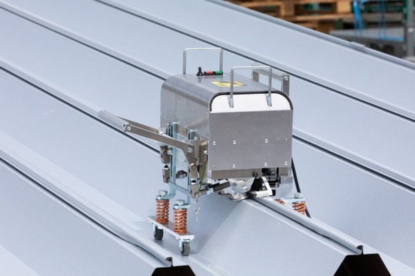 電動鉸め機は梁の上に固定されたタイトフレームと2枚の金属屋根材の端部を金具と共に巻き込んで鉸める機械になる。こうすることでボルト等が不要になり、防水性に優れた屋根となる。