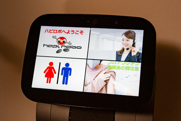 デモ機のメニューパネル。「移動しながらのハピロボ・オフィスの案内」「オペレータとの通話」「トイレの場所まで誘導」「コロナワクチン接種後の注意事項の説明」が、デモとして用意されていた