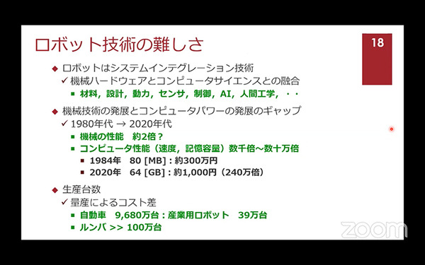 ロボットはシステムインテグレーション技術であり、様々な技術の融合がポイントだ。値段も発展速度も全く違う、機械技術と情報技術の発展のギャップをどう考えるかも重要である。また生産台数の問題もある。残念ながら、ロボットで量産によるコスト低減を目指すのは難しい。これは家庭や作業現場への導入を考えると大きな課題だ。東日本大震災での福島第一原発事故への対応時には理想と現実の違いを多くのロボット研究者が突きつけられた。
