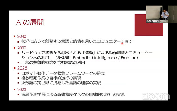 今はタスクの自律遂行の段階だが、それが言語コミュニケーションの話になり、それがハードウェアから早出される情動による動作調整とコミュニケーションにつながるのではないかという。