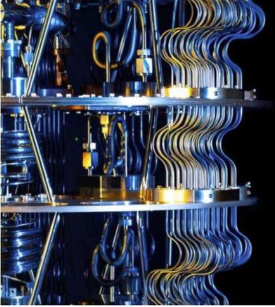 この最先端技術は、1つのQPUにそのような接合を100以上生成する。同アプローチに基づく量子コンピュータは、ハイテクシャンデリアのような強力な冷却装置によって絶対零度近くまで温度を下げることで電子を分離する。(以下の画像を参照)