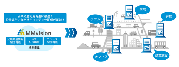 モビリティサイネージクラウド「MMvision」は広告やお知らせ等を配信する従来のデジタルサイネージ配信システムの機能に加え、交通情報(時刻表や運行情報)の配信が可能な、デジタルサイネージ配信プラットフォーム。
