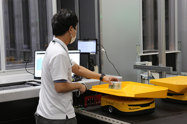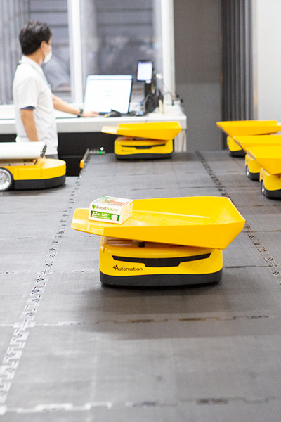 AutoStoreは出荷する商品をランダムにスタッフの手元に運んでくるが、それを発送する梱包単位にシステムと連動して仕分けるのが「t-Sort」の役割だ。スタッフがリーダーで発送する商品を読み込み、「t-Sort」の自動搬送ロボットに乗せると、同時梱包すべき箱まで移送して送り込む。「電卓とボールペンと定規」がランダムのタイミングでスタッフの手元に届いても、「t-Sort」が結局は同じ箱に自動で入れてくれる仕組みだ。