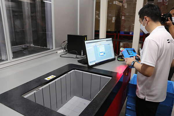 商品が入荷すると、バーコードで商品を読み取る。「AutoStore」のロボットが該当する商品を保管しておくべき箱をキューブ型に積まれた棚から即座にスタッフの手元に送り込んでくる(初入荷の商品ならカラの箱に入れて登録する)。