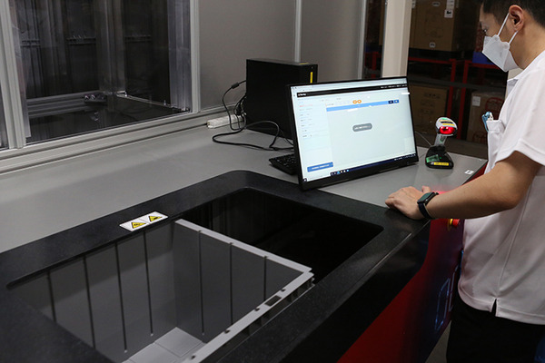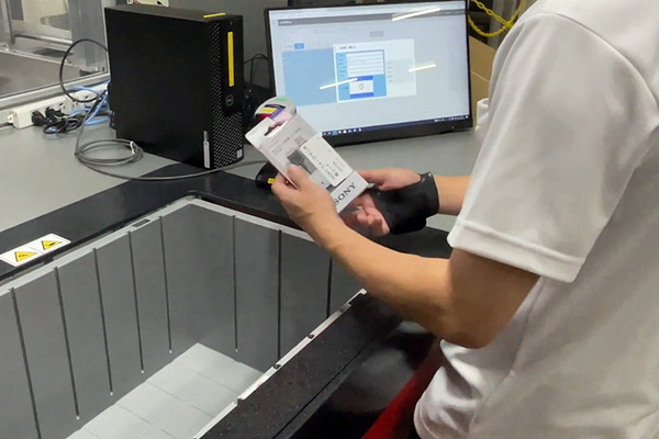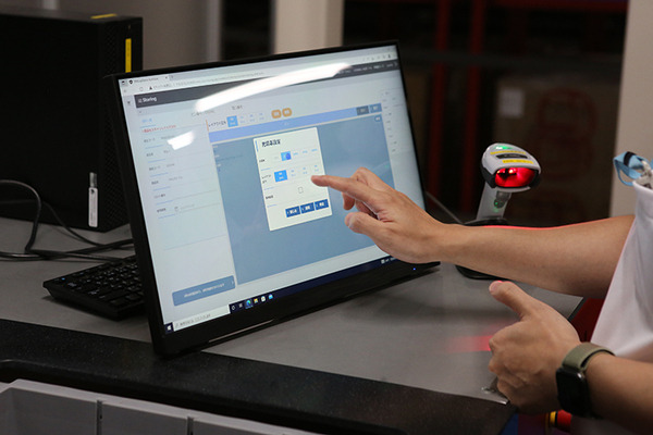 スタッフは簡単な入力を行って、送り出された箱に製品を入れる。