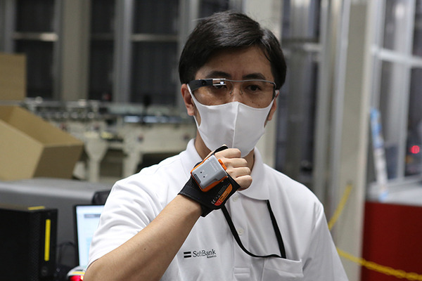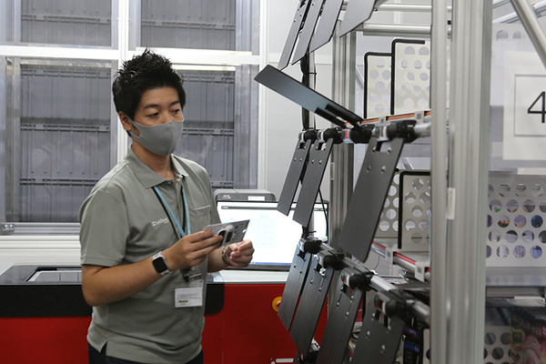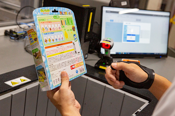 なお、この梱包作業のセクションで、AutoStoreと連動するスマートグラス「Picavi(ピカビ)」と、グローブ式(リストバンド式)のコードリーダーがウェアラブルデバイスとして紹介されていた。スマートグラス「Picavi(ピカビ)」にはシステムからの指示が表示されるディスプレイと同じ内容が表示され、グローブ式コードリーダーは通常のバーコードリーダーと同じ役割をする。(今回はスマートグラスとグローブ式コードリーダーのシステムは稼働していないため、装着イメージのデモだった)