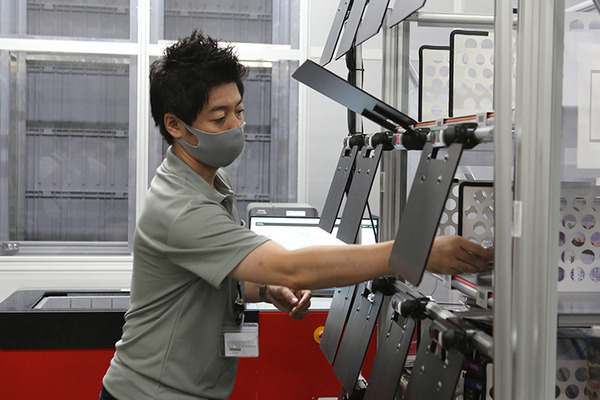 ひとつの製品の棚入れが完了したら次の箱がセットされる。