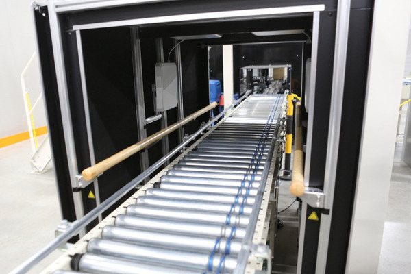 自動梱包システムも公開された。スタッフがディスプレイとコードリーダーを使って発送する商品を確認すると、商品のサイズ、同梱する内容等に併せて、緩衝材が繰り出され、それを詰め込むと作業が完了。後は自動で段ボール箱のサイズをカットして、蓋を閉めて梱包、配送ルートへと送り出す。