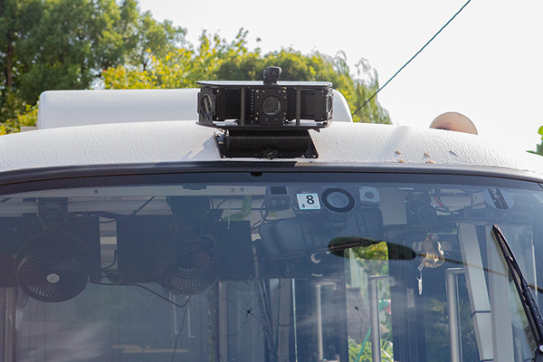 小型の自動運転バスは、報道陣を乗せて約1.3kmの左回り(反時計回り)の周回ルートを、最大19km/hの速度で走行。ハンドルとアクセル、ブレーキ操作はすべて自動運転システムが制御して走行した。