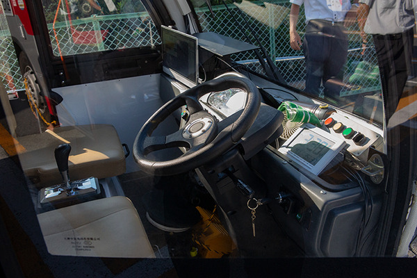 自動運転モビリティの運転席。公道に出たら、運転士はハンドル、アクセル、ブレーキの操作はほぼ全く行なわず、システムがすべて制御して走行した。運転士はハンドルの上のボタンのみ操作し、信号が青で安全に侵入できることを伝えるために使用した