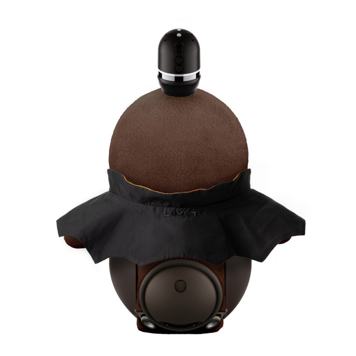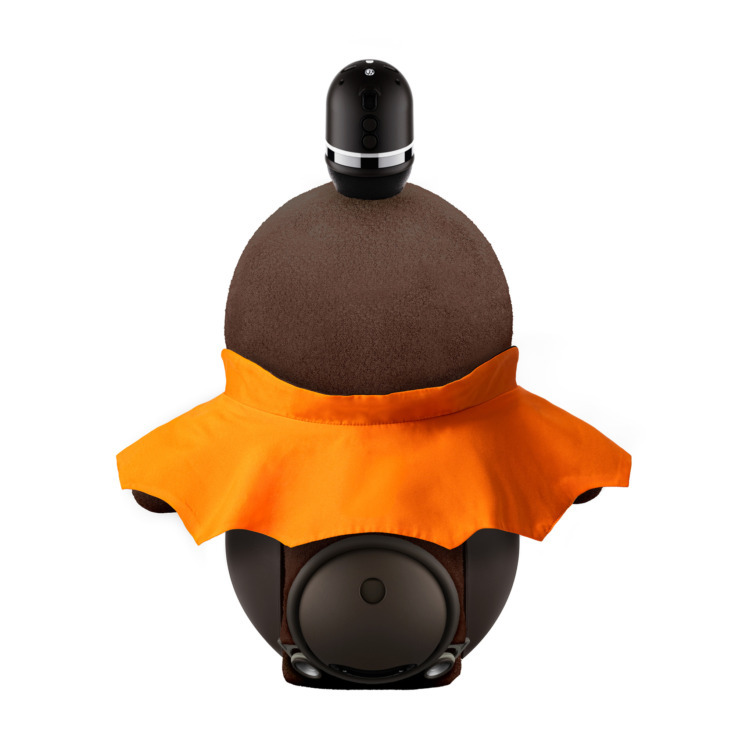 腕を通さず羽織るタイプのデザインで、簡単なスナップボタンの付け外しで着回せるリバーシブル仕様の「ハロウィン リバーシブルマント」。表側はシックなブラック、裏側は鮮やかなオレンジとシーンや気分に合わせて表・裏両方で着回しを楽しめる。裾を真っすぐにカットせずイレギュラーに角度を付けて縫製することで、ひらひらと揺らぐマントらしい優雅なシルエットを実現。ブラックの背中には『LOVOT』の刺繍が入っており、ディテールにもこだわっている