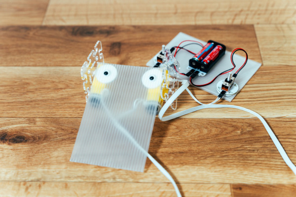 ばんのうジョイントと両面テープ、付属の材料でもあるプラ段ボールは、一度剥がして貼り直しやすい材料。取り付ける場所や向きを間違えてしまっても簡単にやり直すことができる。そして、自分が思い描いた動きを実現できるまで、改良を重ねることもできる。