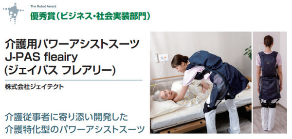 今までのアシストスーツの多くが外骨格タイプであるが、介護に特化というコンセプトに準じて、「内骨格タイプ+アクティブアシスト」を採用し、柔らかい素材による衣服型を追究している。介護系の大学や介護就職展示会の場を活用して、本機を活用した腰痛予防、移乗技術の教育、普及活動も自ら行っており、社会実装への取り組みを評価。
