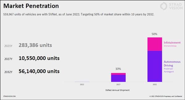 2022年6月時点で、559,967台の車両に「SVNet」が搭載されているが、2032年までに市場シェアの50%となる5600万台を目標に、Tier1企業と連携していきたい考えを示した。