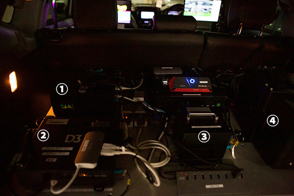 試乗車に搭載されたコンピュータ類。カメラ映像を送信して解析するシステムはトランク部に収容されているコンピュータ類に送られる(下写真)。左の2つのシステムはADAS系デモキット用のユニット。奥がクアルコム(①)、手前がテキサス・インスツルメンツ(TI)ベースの画像解析システム(②)、その右(ほぼ中央)にNVIDIAのJetson Xavier搭載のAIコンピュータ(③)が積まれている。右端のボックスはストレージ類でデータを蓄積する(④)。