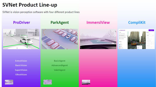 代表的なシステム『SVNet』は大きく分けて、「ProDriver」「ParkAgent」「ImmersiView」「CompliKit」に分類されるという。