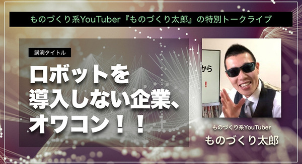 YouTubeのチャンネル登録者数「17万人以上」、製造業・工業系の話題をわかりやすくかつ楽しいトークで語られているYouTubeチャンネル「ものづくり太郎チャンネル」を運営されている「ものづくり太郎」さんに本イベントにお越しいただき、『ロボットを導入しない企業、オワコン!!』と題し、ものづくり太郎さんによる特別トークライブを開催。
