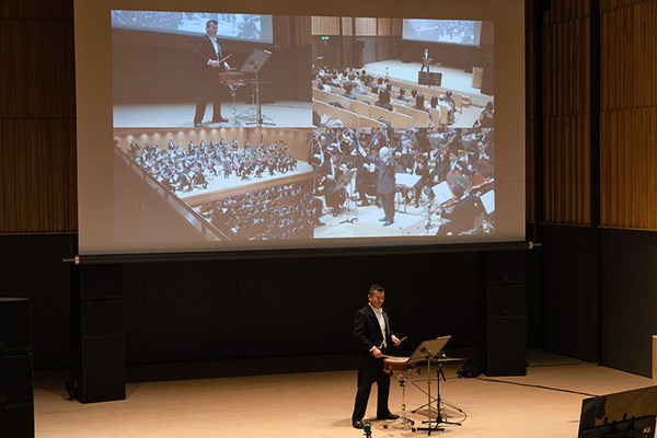 そして、両会場を繋いだ低遅延通信技術を用いてラデツキー行進曲の合奏「リアルタイム・リモート演奏」が行われ、さらにはラデツキー行進曲に合わせ、両会場合わせて約1,600名の観客による手拍子が合奏に合わせて低遅延かつ双方向で配信されることで、約10km離れた会場が一つになった一体感が生まれ、この技術が新しい音楽共創・鑑賞を実現できることが実証された。