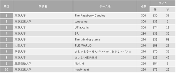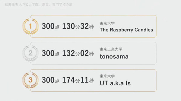 強豪チームを抑え優勝したのは東京大学の「The Raspberry Candies」。2位の東京工業大学の「tonosama」との差は1分30秒と大接戦。満点獲得チーム数は部門では最多の3チームとなった。