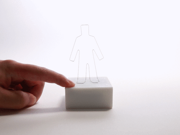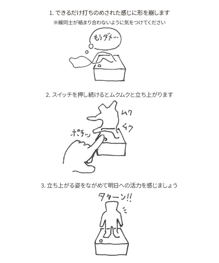 あそびかたは究極にシンプル。電池を入れて、「線人間」をグニャっと好きな形に打ちのめしたら準備完了。スイッチを押し続けるとムクムクと立ち直る。何度押しつぶされても立ち上がる健気な線人間の姿を眺めて明日への活力をほんの少しでも感じてもらえたら、そんな思いが込められている。