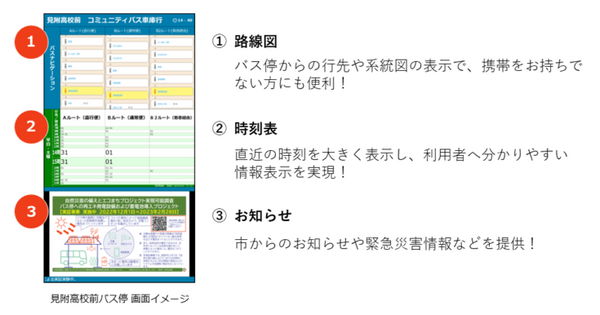 スマートバス停はデジタルサイネージにバスの運行時刻表はもちろん、その他のお知らせや広告などを表示できるバス停のことで、現在の曜日や時間帯の時刻を大きく、わかりやすく表示できるなど、ユーザーの利便性向上にも寄与する機能を備えている。また、遠隔操作や公共交通機関関連情報の標準データフォーマット「GTFS-JP」連携により、時刻表作成業務の自動化が可能となり、張り替え作業が不要となるため、自治体DXの推進に大きな効果が期待される。