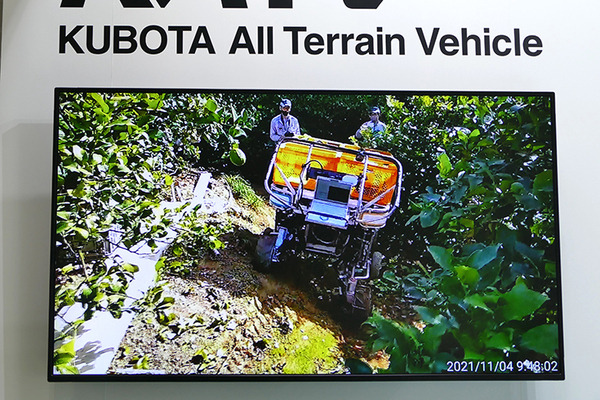 農機メーカー国内最大手のクボタは全地形対応型の4輪搬送用ロボットを初公開した。幅116cm、長さは155-234cm。重量は340kg。山間部など不整地(凹凸のある場所)、路面でも脚を曲げ伸ばしすることで、荷物を搭載するデッキ部分を水平に保って走行できる。