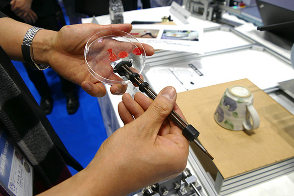 このほか、ヘラの剛性を簡単に変えられる機構なども提案されていた。たとえば多くの人が実際にやってみたことがあると思うが、プラスチックの下敷きをちょっと曲げると、多少重量のあるものも持ち上げることができる。それと同じ理屈で、ヘラの端を少したわめたり緩めたりすることで、ヘラの先の硬さを切り替えて、モノを運べるのではないかという提案だ。もともとは細胞シートの搬送などを用途として考案したものとのこと。