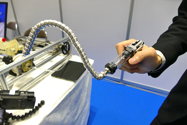 このほか、同じく流体を使うことで、表面全体の硬さを変えて物体のサポートができる「無限回転式柔剛切替メカニズム」の研究開発も進めている。将来は小型化してロボットハンドへの適用や、対象に柔らかくなじみつつも適度に硬くしてサポートもできるクローラーベルト等へ適用できるという。