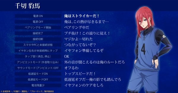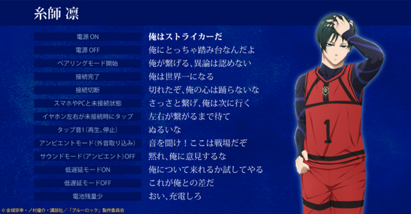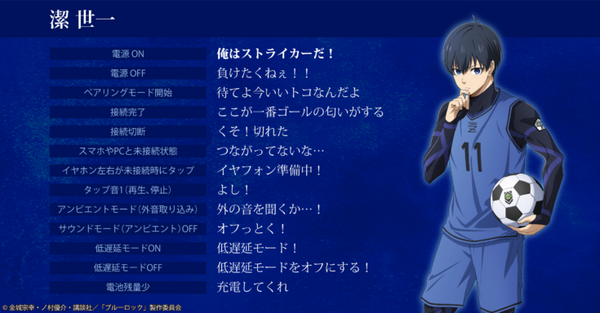 コラボレーションモデルは購入時に、「潔世一(浦和希)」「蜂楽廻(海渡翼)」「千切豹馬(斉藤壮馬)」「凪誠士郎(島﨑信長)」「糸師凛(内山昂輝)」から搭載する音声のキャラクターを選んで購入する。「電源オン」「電源オフ」などの操作音の他に、アプリ『Zeeny アシスタント』と連携することでシークレットボイスも楽しめる。※( )内はキャラクターを担当するCV