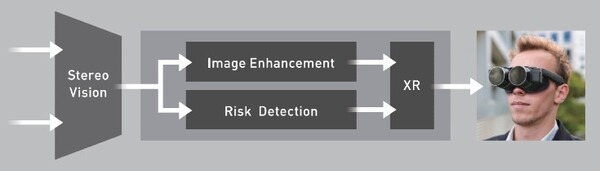 AIとロボティクス技術により、カメラとセンサーで捉えたシーンを分析し、障害物、段差、穴などの移動の際の危険を検出し、MR(Mixed Reality)技術により、使用者の残りの視力に合わせた映像表示を行う。