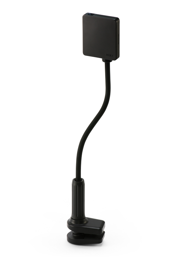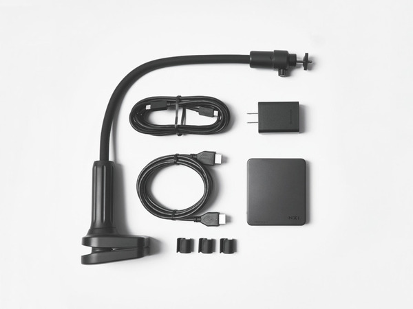 「NX1」専用のフレキシブルアームは、厚さ55㎜までの板面に挟んで取り付けることができ、取り付ける位置や角度を部屋の環境に合わせて自由に変更できる。その他、約3mの電源ケーブルや結束クリップなど、設置自由度を高めるさまざまな付属品が同梱されている。