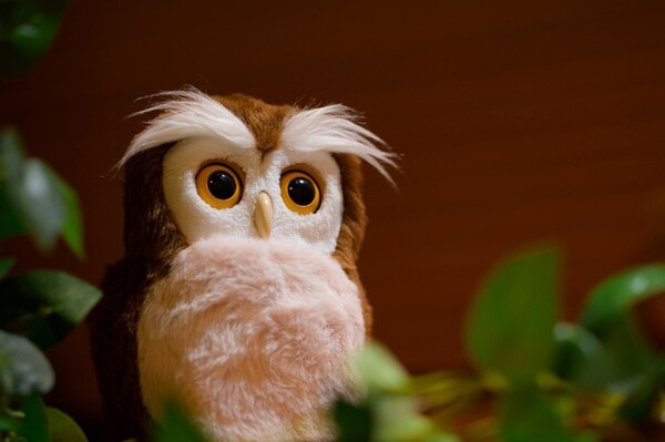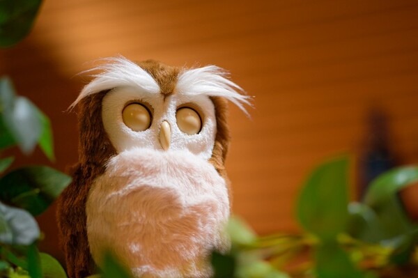 クルクル動く目とふわふわな毛並みをもつ、手のひらサイズの同ふくろうは、頭の中央(やや前側)に頭センサーがついていて、遊ぶモードを選ぶ時や音量設定、おしゃべりをする時に使う。また、ふくろうのお腹にあるおはなしセンサーで、周囲の音が聞こえると反応しておしゃべりをする。