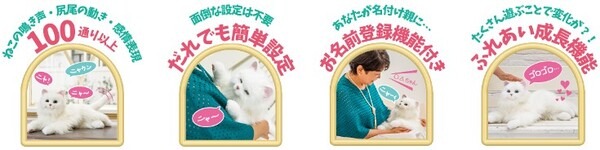 本物みたいな「しっぽ」の動きと「鳴き声」で感情表現が豊かな同ロボットは、愛らしい見た目と動き、鳴き声だけなく、毎日の生活が楽しくなる充実した機能が盛りだくさんとなっている。