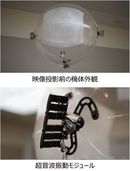 今回開発した新型機体は、機体本体が透明フィルムの風船で、機体に搭載した小型プロジェクターによりドローン本体に映像を投影しながら飛行できる。さらに、推進力の向上による安定した飛行のほか、投影映像のリアルタイム伝送を実現した。また、従来の機体と同様に、アクションカメラを搭載することも可能であり、高画質な映像を空中から撮影することができる。