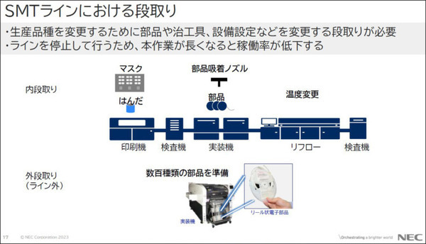 NECプラットフォームズでは、一つのSMTライン(Surface mount technology:電子部品の基板表面実装/下図参照)で1日に約30品種もの製品を生産しているため、品種の変更の際には数百種ある部品や製造条件の設定を変更する「段取り」を行う必要がある。