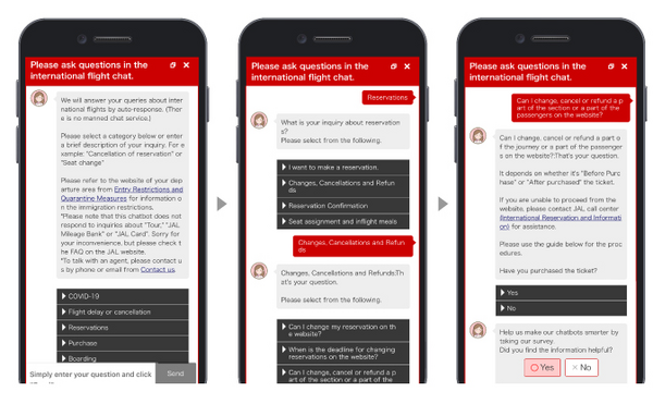 日本航空(JAL)はWebサイトにAIチャットボット「AIChat」を導入し、国内を含む世界26地域のWebサイト47ページに英語版「チャット自動応答サービス」を2022年9月末に一斉リリースした。開発はKDDIエボルバで、稼働から2か月、2022年11月末時点で同サービスの回答カバー範囲は92%に達しているという。KDDIエボルバが2023年1月30日に発表した。