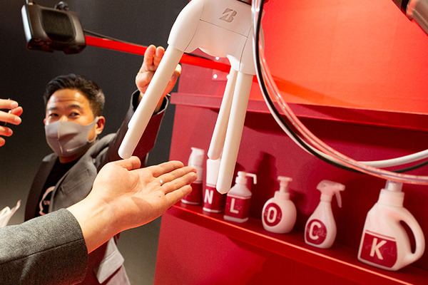 東京小平で開催された「Bridgestone Innovation Park」の会場入口では、この日お披露目となるロボットハンドを搭載したアームロボットが報道陣を迎えてくれた。ロボットはひとりひとりにボトルウォーターを手渡し、来場者と握手をした。ゴム製のロボットハンドは柔らかく、どこか温かみを感じるものだった。