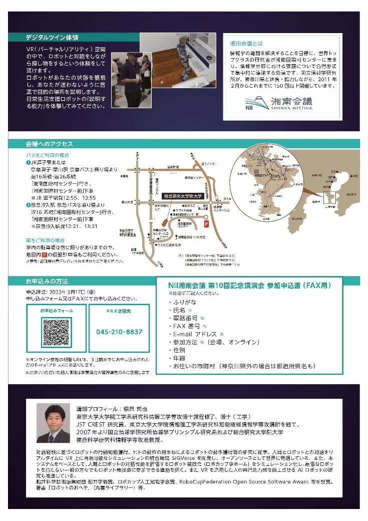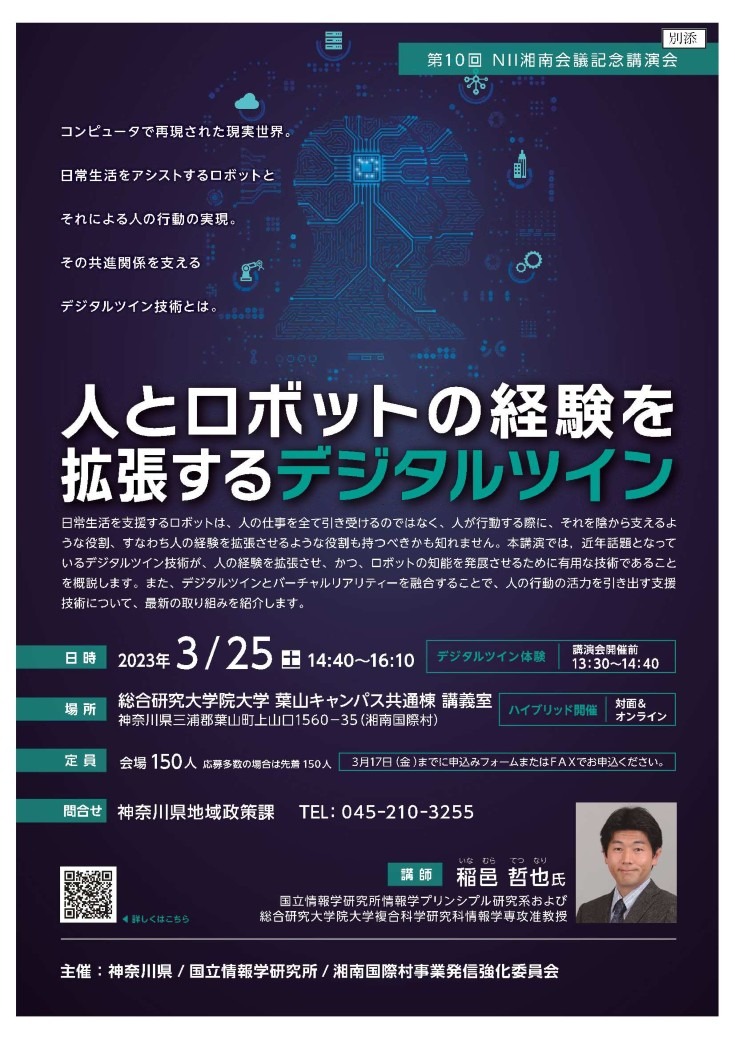 | 定員 | 会場参加は先着150人、オンラインは定員なし ※神奈川県、国立情報学研究所及び湘南国際村事業発信強化委員会の主催により実施。 |