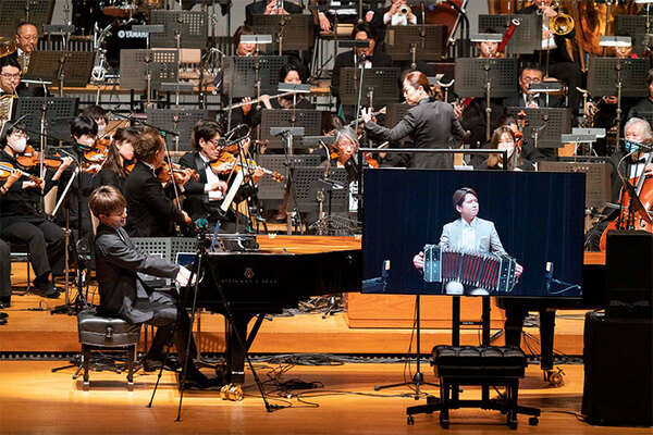 休憩を挟んで、東京と大阪にわかれたピアノデュオ「アン・セット・シス」に、横須賀からバンドネオンの三浦一馬さんが加わった。東京と大阪でピアノ、横須賀でバンドネオンと、3拠点で「フーガと神秘」などを合奏。観客はその音色に酔いしれた。