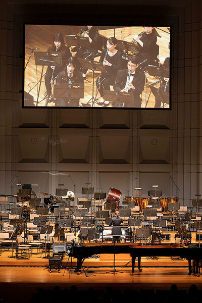 大阪会場では、大阪芸術大学ウィンド・オーケストラが登場。東京の三ツ橋 敬子さんが指揮し、ウィンド・オーケストラが演奏するという快挙を成し遂げた(東京・大阪それぞれに双方が写ったモニタが設置され、音と共に指揮や奏者の映像はそのモニタで同期した)。