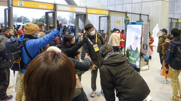 豊田スタジアムのメインゲートでは、昨年と同様「サイネージロボット」も来場者を出迎えた。このロボットは自律動作または遠隔操作によって移動することができ、来場者の近くで停止し、来場者の性別や年齢などの属性を顔認証技術で判断して、それに合わせた情報を大型のディスプレイで発信することができる。今回は、属性に効果的と予想される選手の公式映像やグッズ情報などの広告/情報を放映し、多くの人が注目していた。また、実証実験としては、今後の有効活用に繋げるために視聴者数や滞留時間のデータ収集なども行なった。