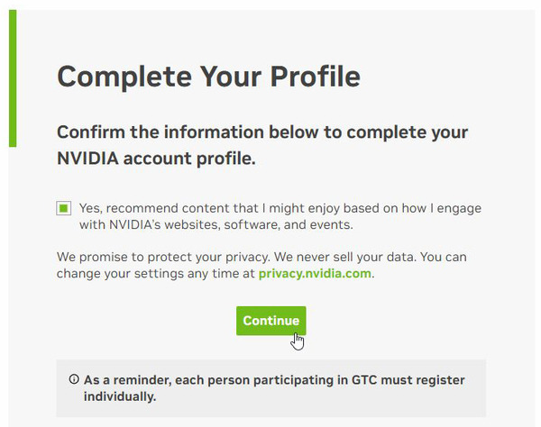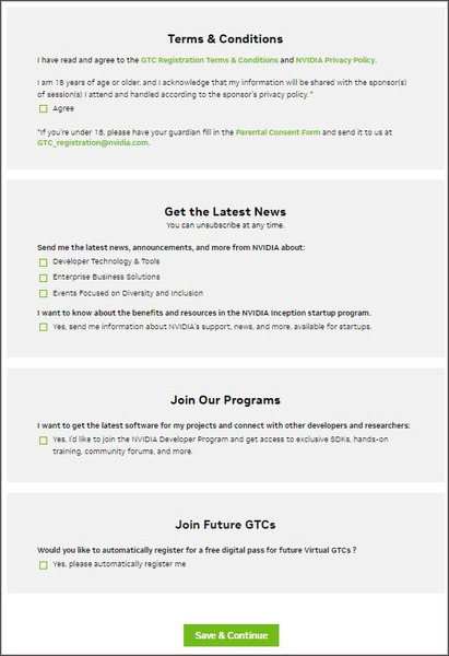 「プライバシーポリシー」の同意(「agree」をクリック)、「最新ニュースをNVIDIAから受け取りたいか」、「NVIDIAのプログラムに参加したいか」(SDKを入手したり、他の開発者と情報共有するなど)、「今後開催されるGTCオンラインに自動で参加登録したいか」が表示されているので、希望する場合はクリックして「Save & Continue」をクリックする。