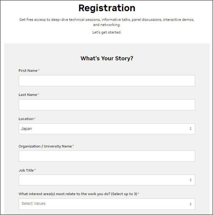 お名前(名、姓)、場所、企業/学校名、タイトル、興味のある分野、NVIDIAのニュース登録など、必要項目に入力したり、メニューから選択する。(*は入力必須項目)
