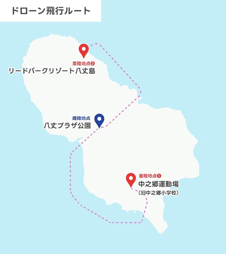 同実証実験では、交通が不便な地域に住む島民への買物支援や観光施設との連携を想定し、ドローンによる配送先を2か所(①中之郷運動場、②リードパークリゾート八丈島)設置し、店舗が多く集まる地域にほど近い八丈プラザ公園からドローンで配送した。なお、実施回数はテスト飛行含む計11回であった。